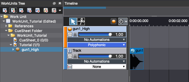 执行到此为止的脚本时,可以检查在工作单元的素材根文件夹中已创建的 "gun1_High.wav" 素材。