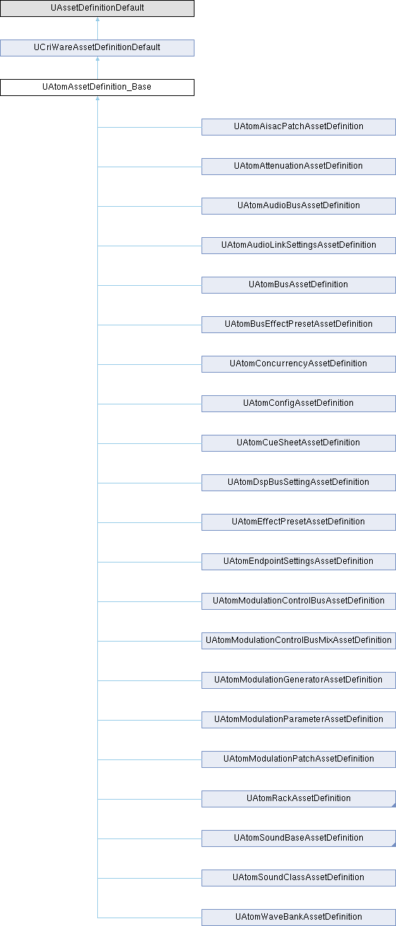 UAtomAttenuationAssetDefinition, UAtomAudioBusAssetDefinition, UAtomAudioLinkSettingsAssetDefinition, UAtomBusEffectPresetAssetDefinition, UAtomConcurrencyAssetDefinition, UAtomEffectPresetAssetDefinition, UAtomEndpointSettingsAssetDefinition, UAtomModulationControlBusAssetDefinition, UAtomModulationControlBusMixAssetDefinition, UAtomModulationGeneratorAssetDefinition, UAtomModulationParameterAssetDefinition, UAtomModulationPatchAssetDefinition, UAtomRackAssetDefinition, UAtomSoundClassAssetDefinition, UAtomSoundCueAssetDefinition, UAtomSoundProxyAssetDefinition, UAtomSoundSimpleAssetDefinition, UAtomSoundSourceBusAssetDefinition, UAtomSoundWaveAssetDefinition, UMySoundAssetDefinition (計20項目)で再実装されています。
