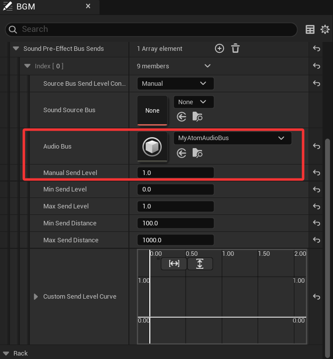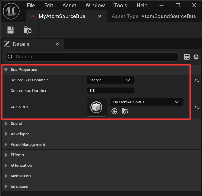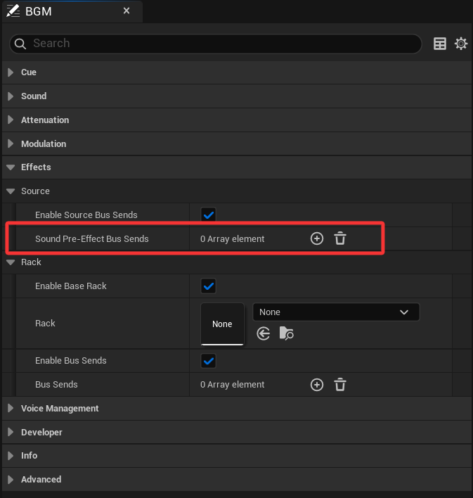 在源资产(Atom Sound Wave、Atom Sound Cue等)的“详细信息”面板中,您可以配置发送音频的音频总线。在“效果”>“源”下,单击“前置EffectBus发送”的“添加”(+) 按钮,以添加在之前或之后发生的可选源效果链。 (后期EffectBus发送在ADX上尚不可用。)