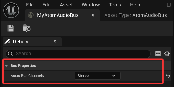 要编辑音频总线,请在内容浏览器中双击它,或右键单击并从上下文菜单中选择“编辑”。然后,在出现的“详细信息”面板中,将“音频Bus通道”设置为所需的通道数。