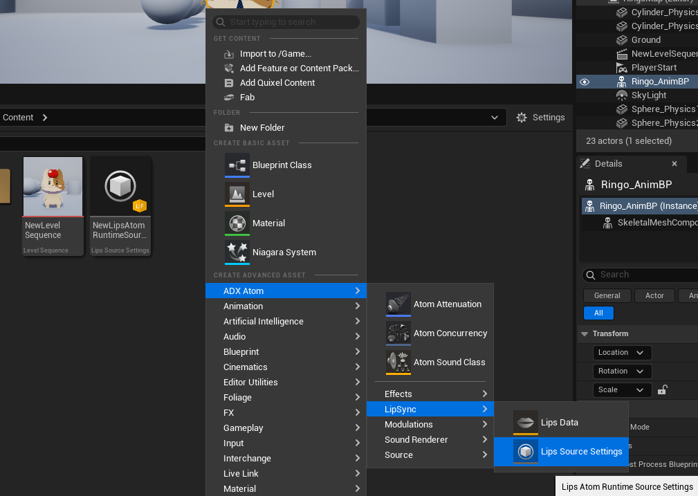 可以通过右键单击内容浏览器并选择“ ADX Atom ”→“LipSync”→“Lips Source Settings”来创建资产。