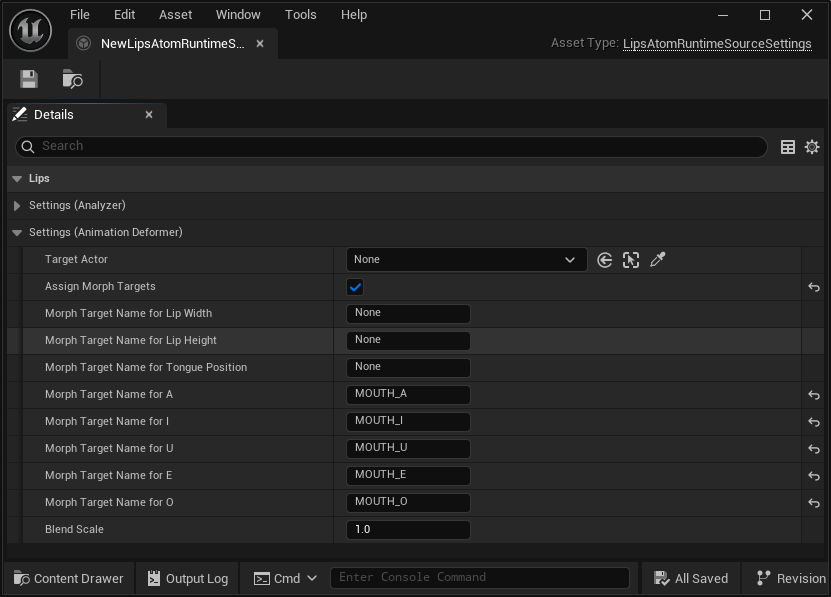 要应用资产,只需将 Override Source Settings 标志设置为 False 并在 Lips Source Settings 中指定创建的 Lips Source Settings资产即可。