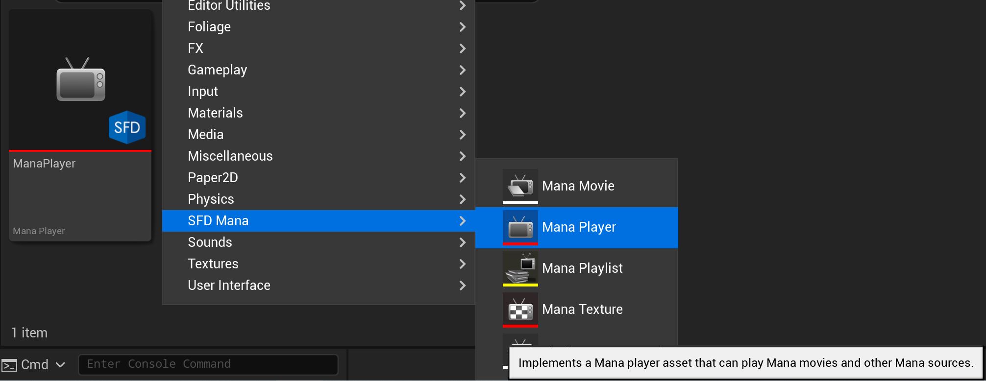 您可以通过从内容浏览器菜单中选择“SFD Mana -> Mana Player”来创建它。