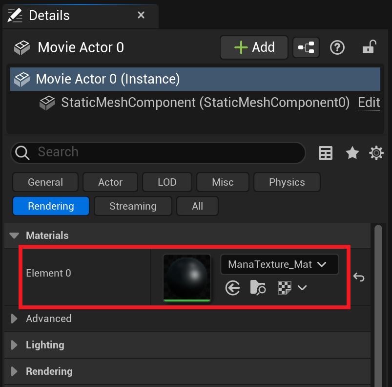 从放置在关卡上的 Actor 的详细信息面板中的“ 材质 -> 元素 0 ”中设置材质资产。