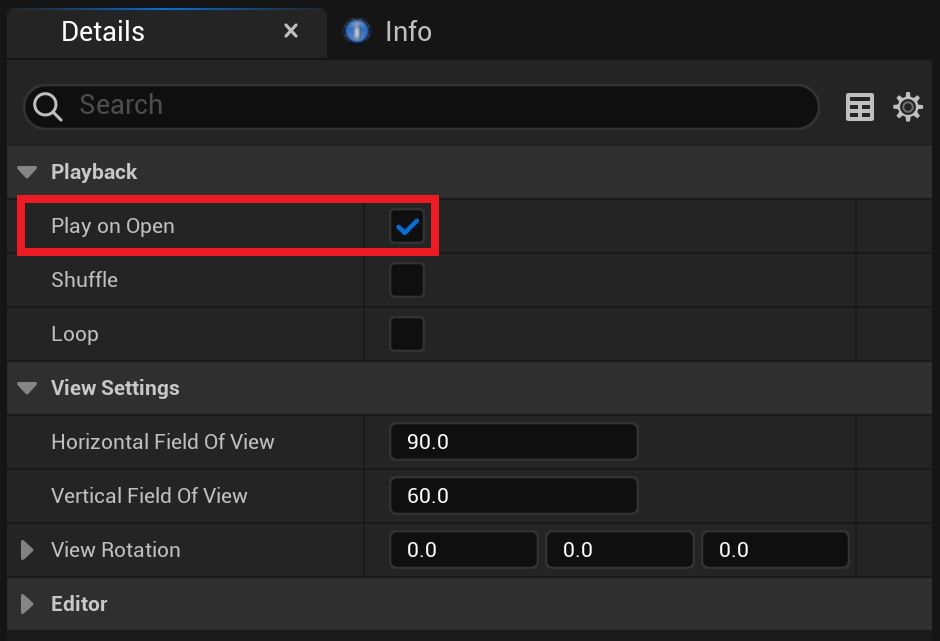 确保从 Mana Player 资产详细信息面板启用 Play on Open 。