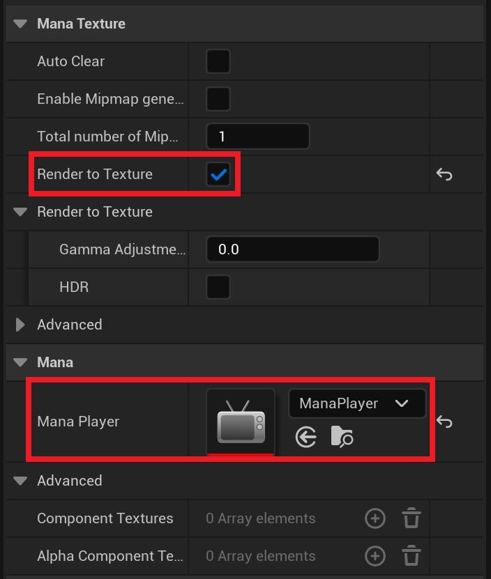 从 Mana Texture 资产的详细信息面板将 Mana Player资产设置为 Mana Player 。